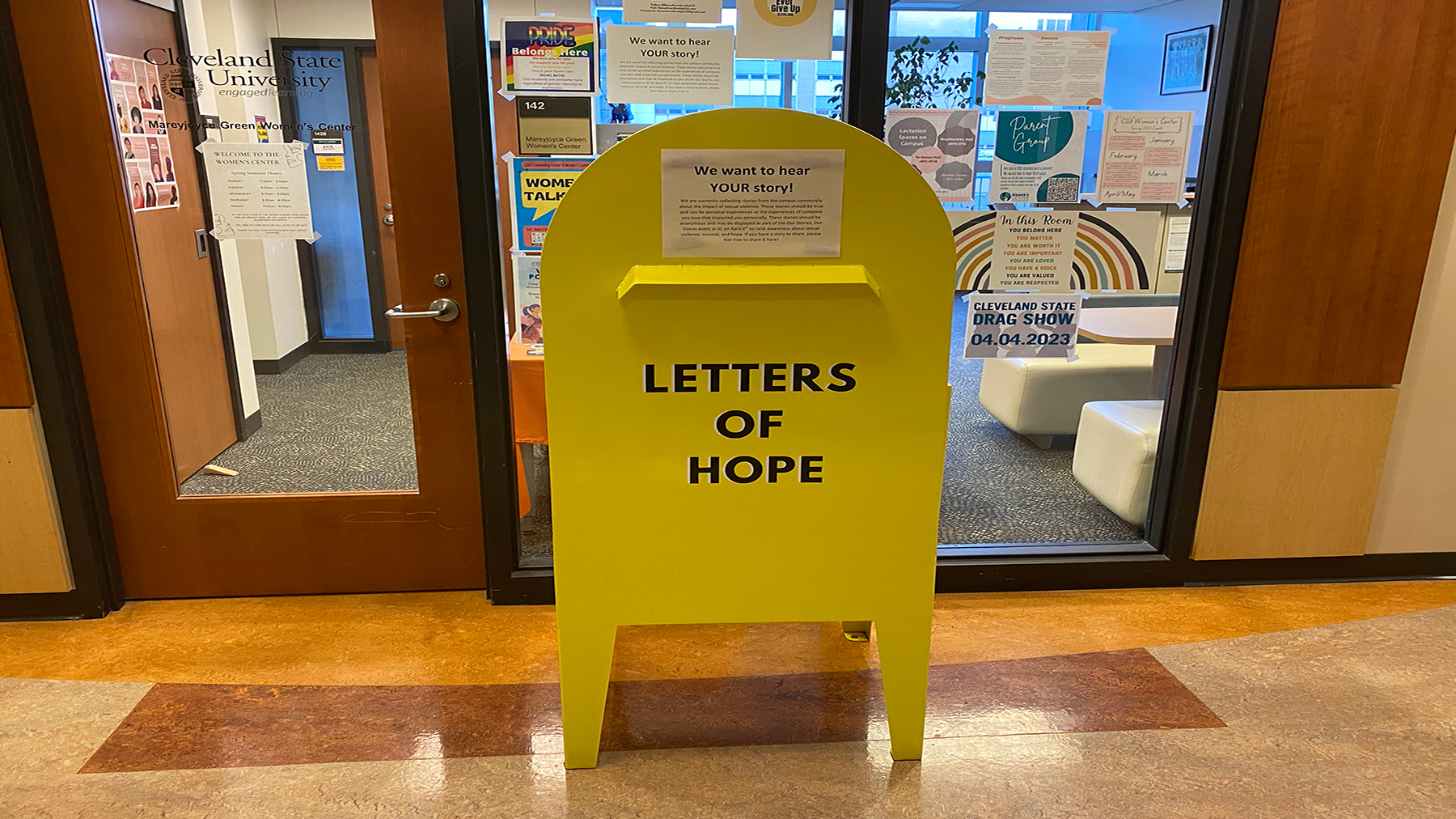 A bright yellow mailbox, named the “Letters of Hope” box, has been placed outside of the Women’s Center, located in Berkman Hall at room 142, to accept anonymous stories of sexual violence from survivors now until March 31.
